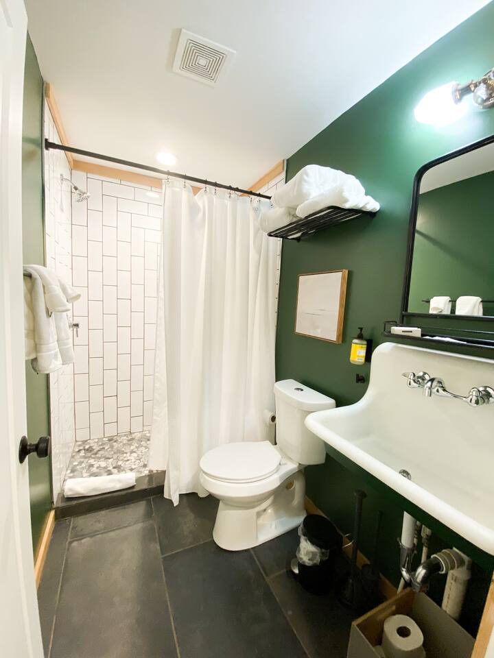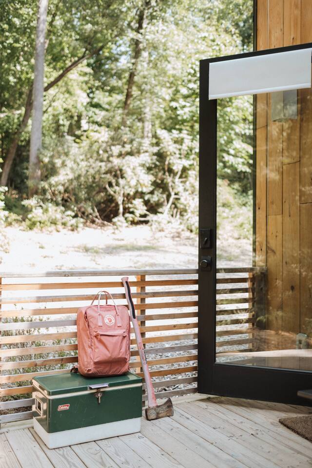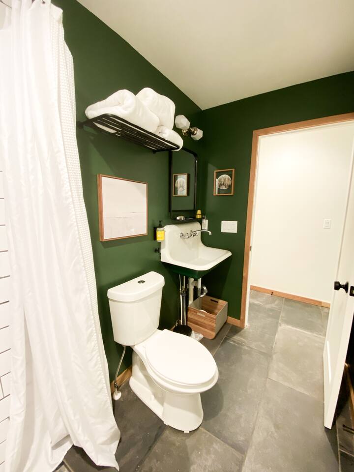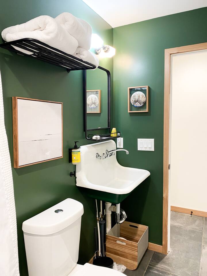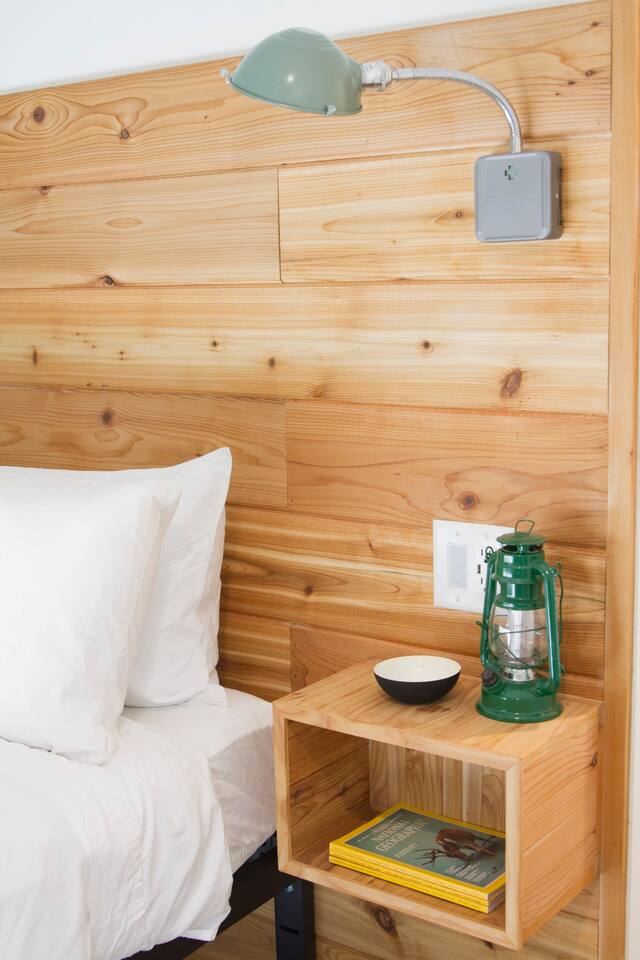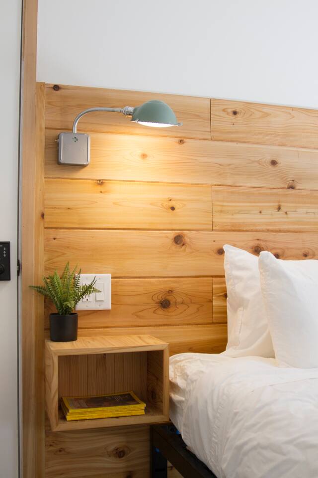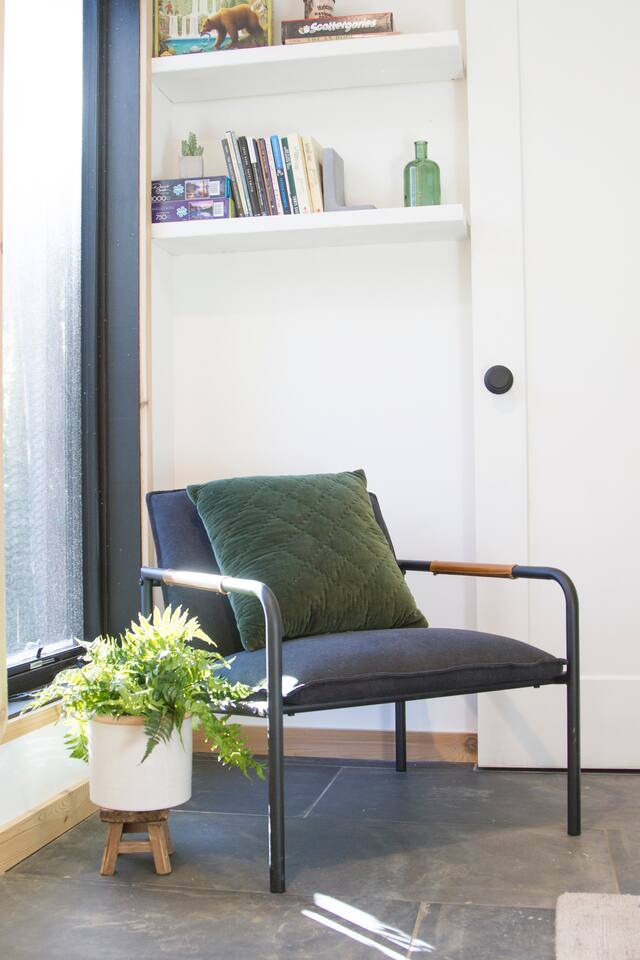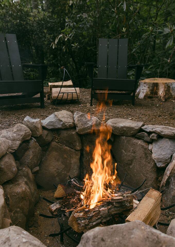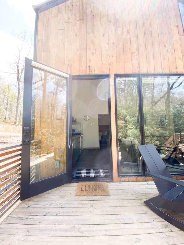 This unit is a one bedroom, one bathroom with a full kitchen and is on the back of the cabin. Our full kitchen offers a french press and milk frother to start your day off right. So that your toes never get cold, the unit has heated tile floors through out and a Malm fireplace to snuggle in front of. The king sized Tuft and Needle bed is covered in the softest 100% cotton sheets and duvet. Pillows have been selected to give options so you can find the perfect pillow. Lunori was crafted to allow our guests to slow down, enjoying the simpler things that the mountains offer. While the crazy day to day of our lives keeps us always connected with little patience, the mountains give us a chance to take a breath. For this reason we have stocked the unit’s bookshelf with a curated collection of books, games, and bluetooth speaker. We offer high speed internet but we do not offer TVs or microwaves, simply because in the mountains you have time! We offer a communal firepit, charcoal grill, picnic area, and hammock. The communal area is shared with all 4 of our units.