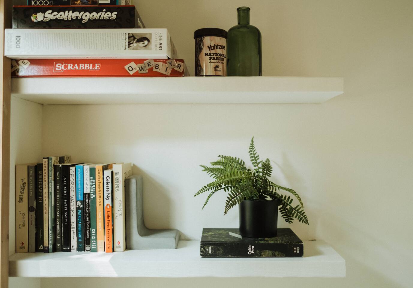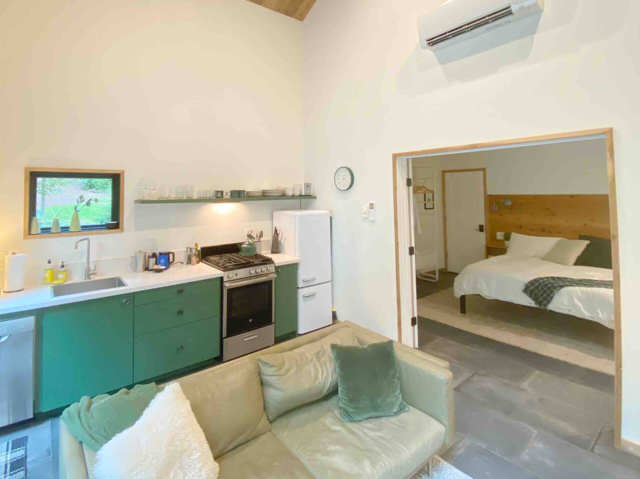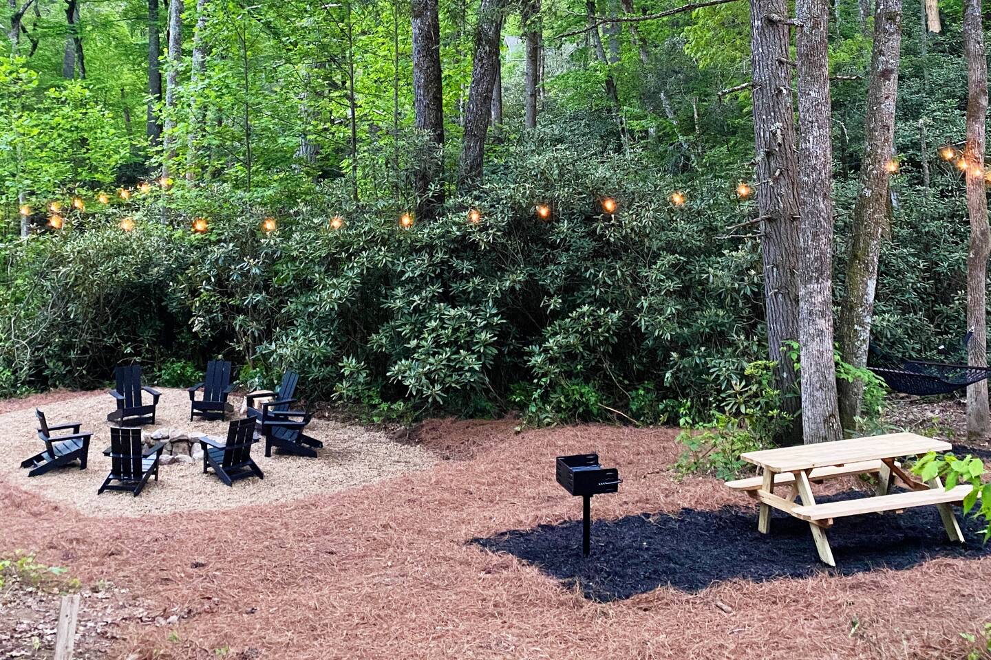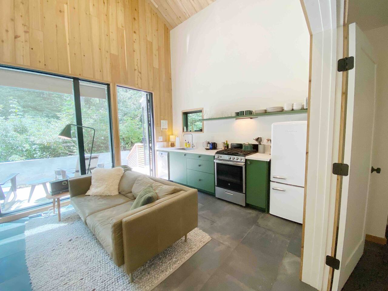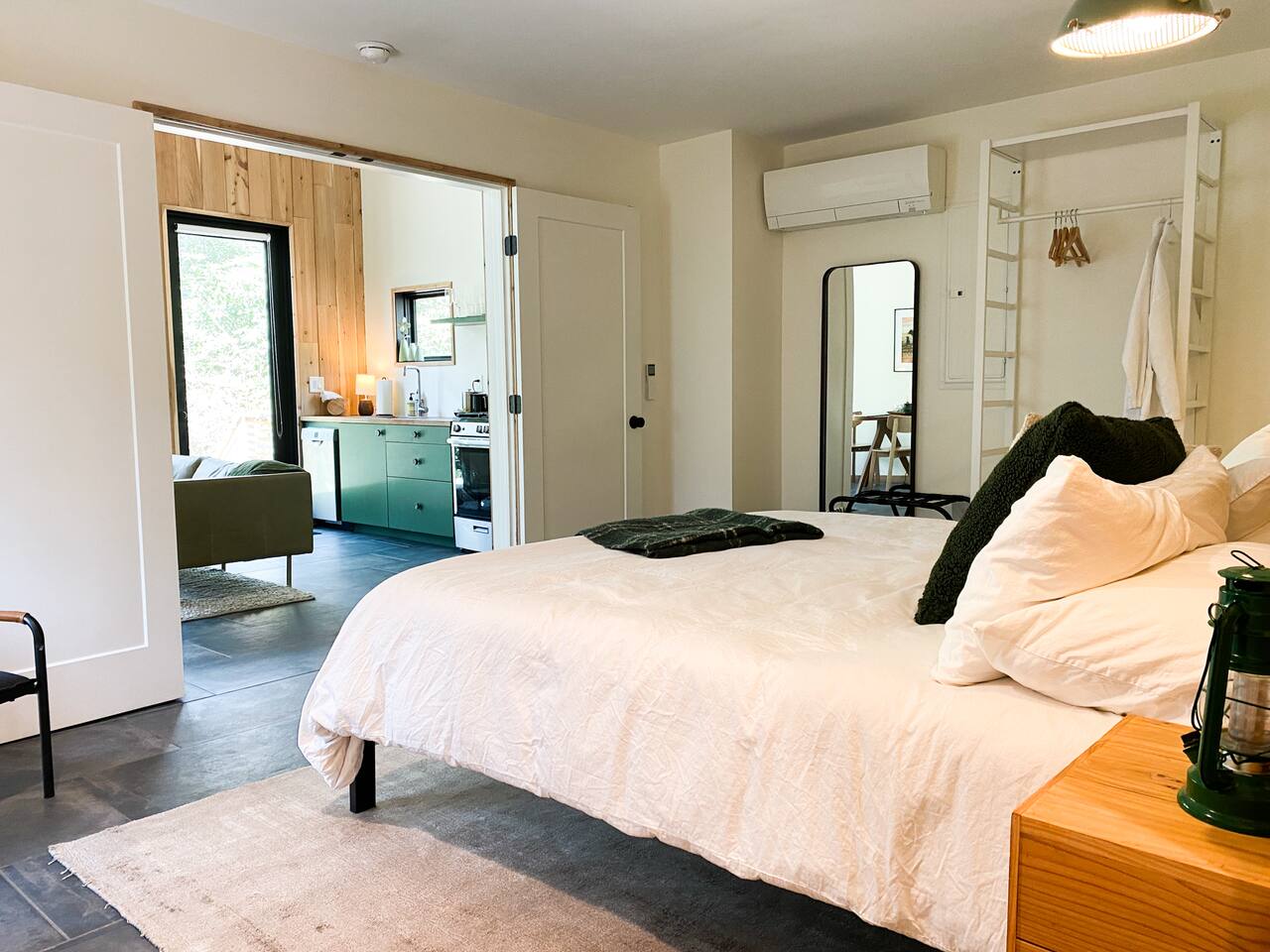 This unit is a one bedroom, one bathroom with a full kitchen and is on the back of the cabin. Our full kitchen offers a french press and milk frother to start your day off right. So that your toes never get cold, the unit has heated tile floors through out and a Malm fireplace to snuggle in front of. The king sized Tuft and Needle bed is covered in the softest 100% cotton sheets and duvet. Pillows have been selected to give options so you can find the perfect pillow. Lunori was crafted to allow our guests to slow down, enjoying the simpler things that the mountains offer. While the crazy day to day of our lives keeps us always connected with little patience, the mountains give us a chance to take a breath. For this reason we have stocked the unit’s bookshelf with a curated collection of books, games, and bluetooth speaker. We offer high speed internet but we do not offer TVs or microwaves, simply because in the mountains you have time! We offer a communal firepit, charcoal grill, picnic area, and hammock. The communal area is shared with all 4 of our units.
