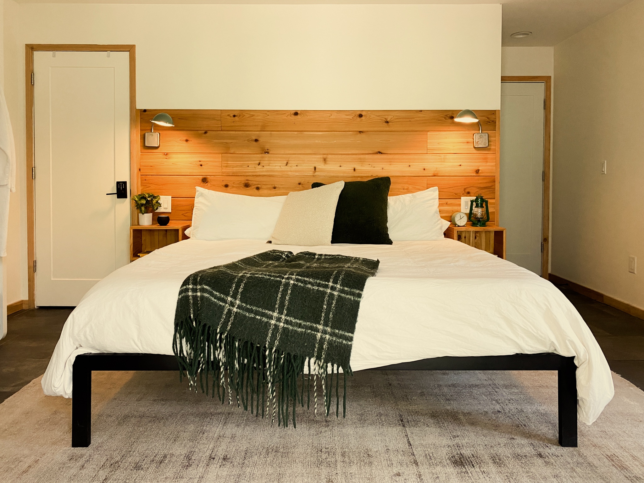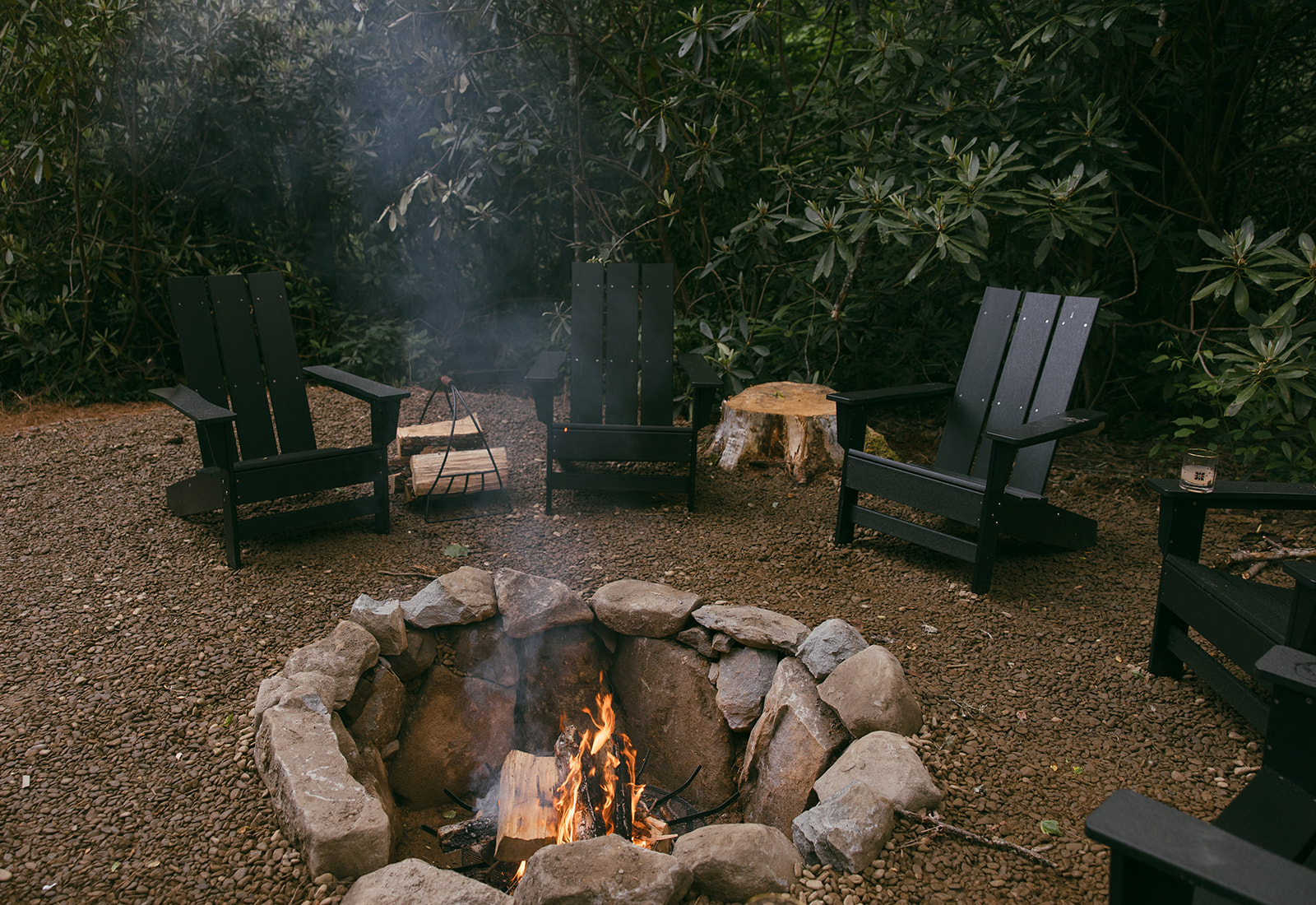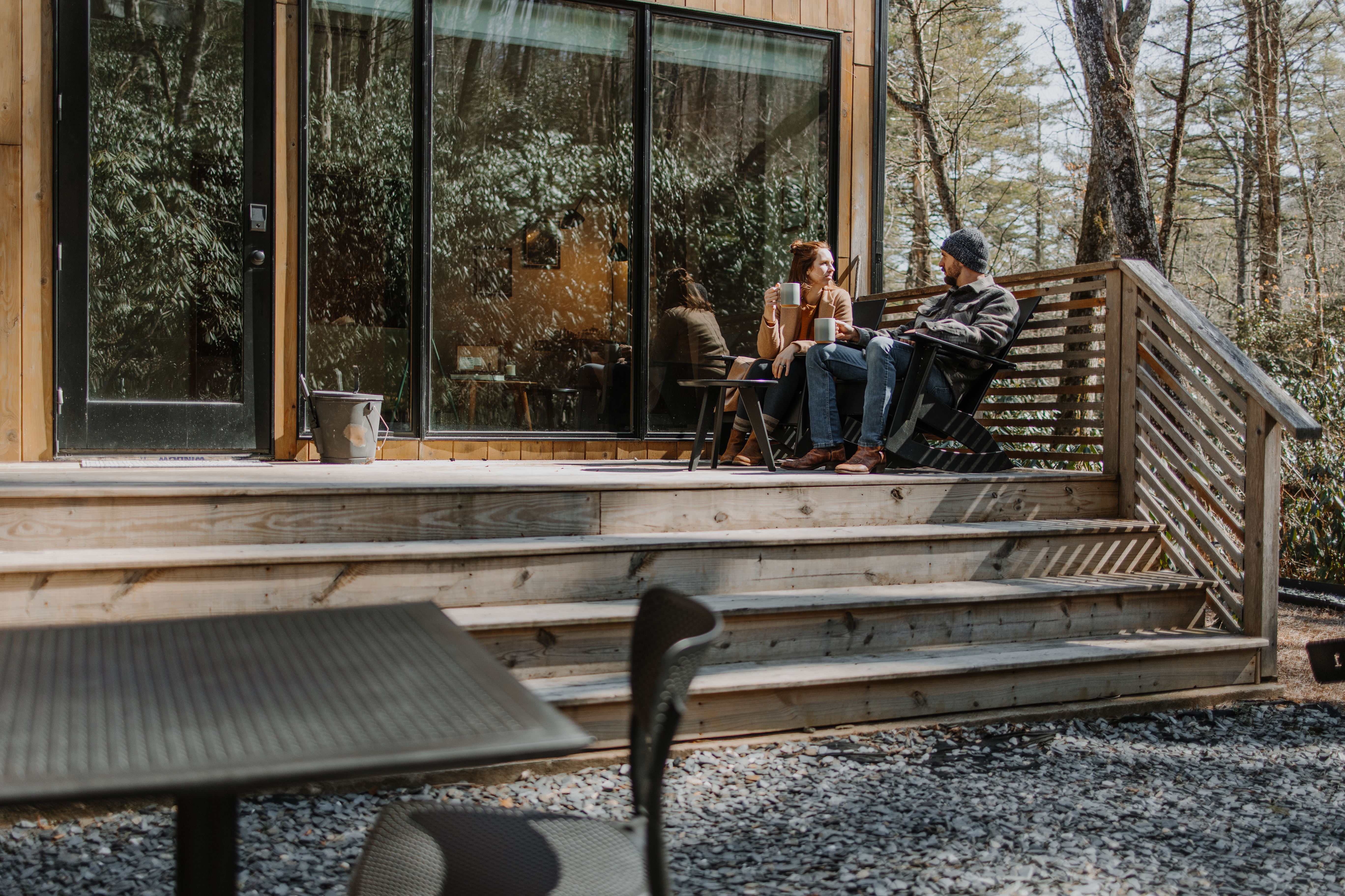 The layout is simple and uncluttered, with warm materials and soft lighting that shift naturally throughout the day. SLEEPING AND LIVING The space centers around comfort and warmth. • King bed with comfortable hotel quality linens • Malm fireplace for cozy evenings • Heated floors throughout KITCHEN The kitchen is fully equipped for cooking and enjoying meals at a relaxed pace. • Full kitchen with essentials for cooking • French press for coffee It does not include a microwave, in keeping with the slower, more intentional feel of the space. BATHROOM • Full bathroom with walk in shower and modern fixtures OUTDOOR SPACES Just outside, you’ll find your own private patio. • Private patio with outdoor seating, separate from shared areas and exclusively for your use The property also includes shared outdoor spaces designed for gathering and relaxing: • Fire pit, charcoal grill, picnic area, and hammock • Shared across all four units Mornings often begin with coffee on the patio, while evenings wind down by the fire.