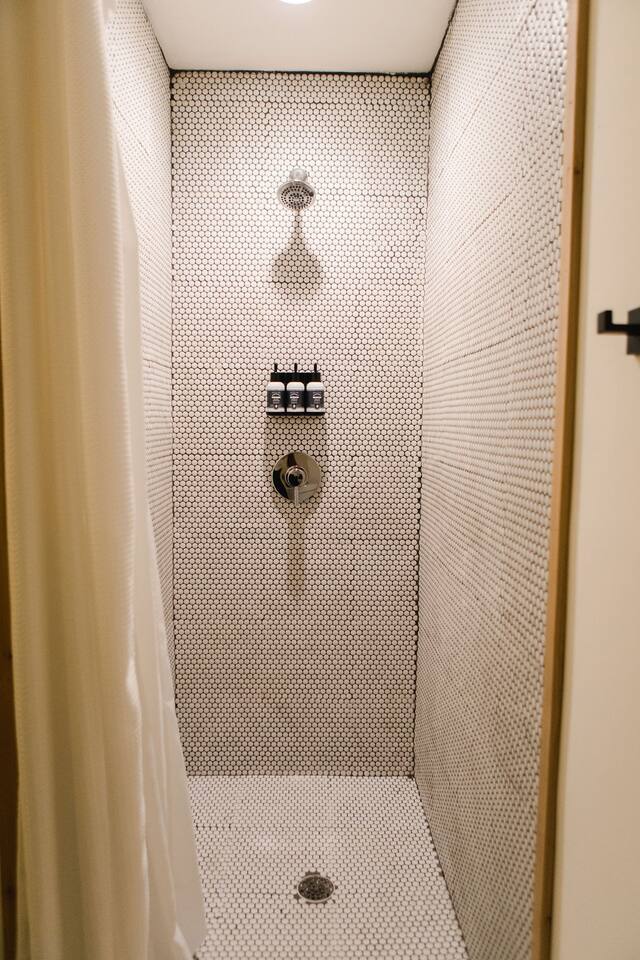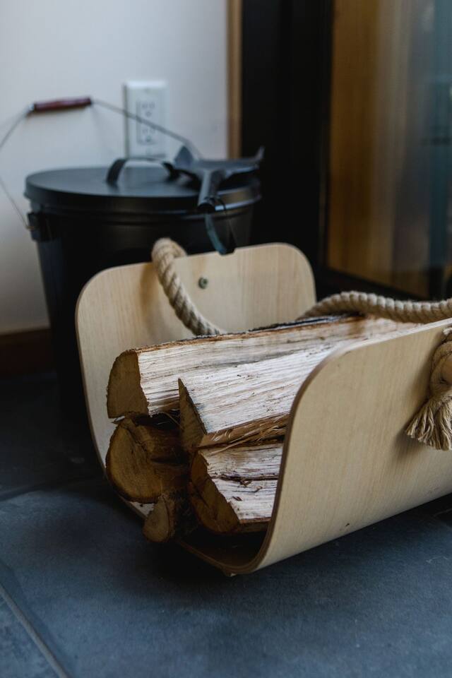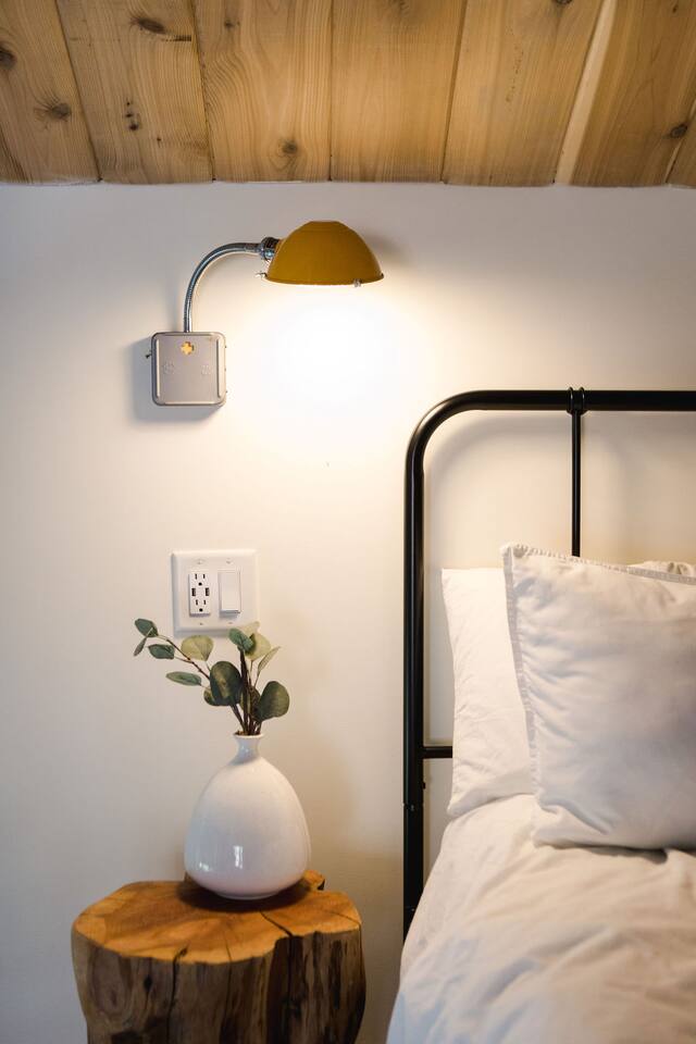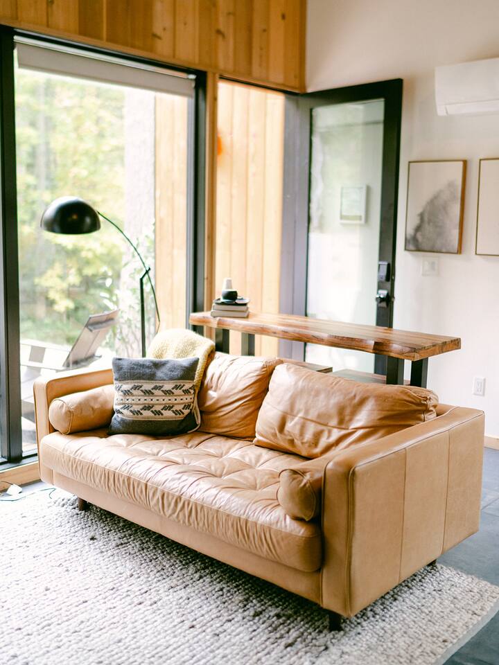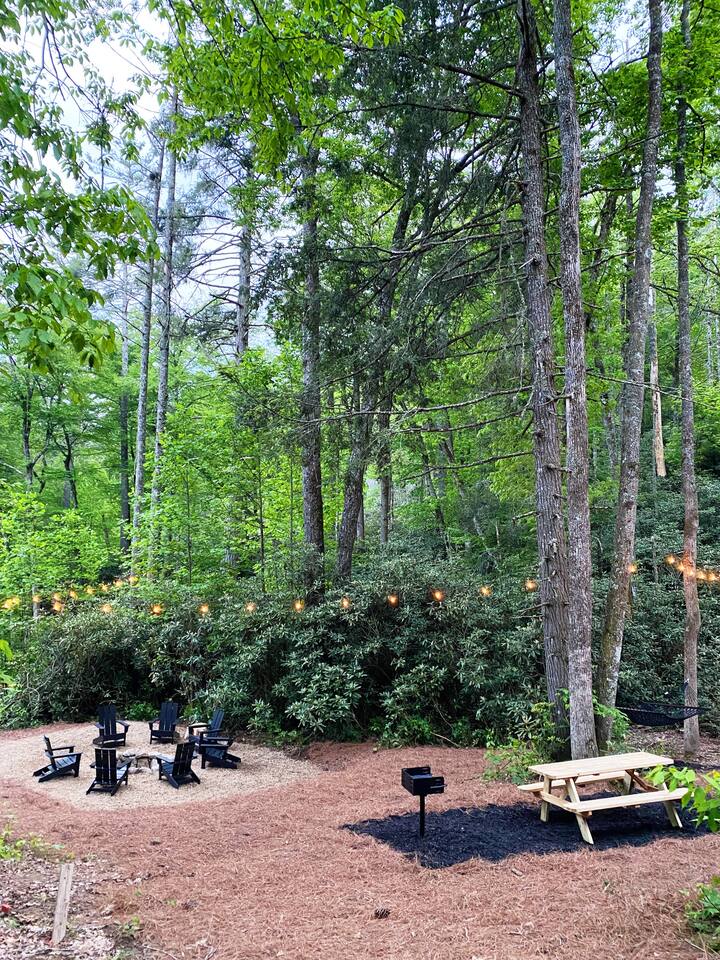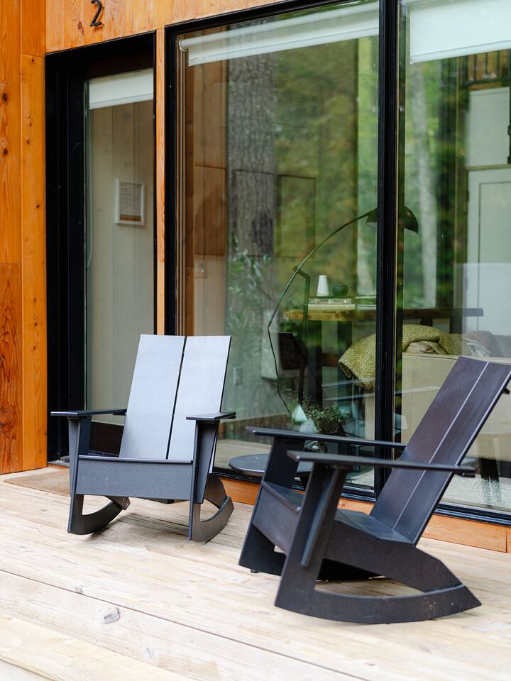 This unit is a one bedroom, one bathroom with a kitchenette and is on the front of the cabin. Our kitchenette offers a French press, electric kettle, and milk frother to start your day off right, as well as a toaster oven and electric skillet to eat breakfast in bed. So that your toes never get cold, the unit has heated tile floors through out and a Malm fireplace to snuggle in front of. The king sized Tuft and Needle bed is covered in the softest 100% cotton sheets and duvet. Pillows have been selected to give options so you can find the perfect pillow. Lunori was crafted to allow our guests to slow down, enjoying the simpler things that the mountains offer. While the crazy day to day of our lives keeps us always connected with little patience, the mountains give us a chance to take a breath. For this reason we have stocked the unit’s bookshelf with a curated collection of books, games, and bluetooth speaker. We offer wifi internet but we do not offer TVs or microwaves, simply because in the mountains you have time! We offer a communal firepit, charcoal grill, picnic area, and hammock. The communal area is shared with all 4 of our units.
