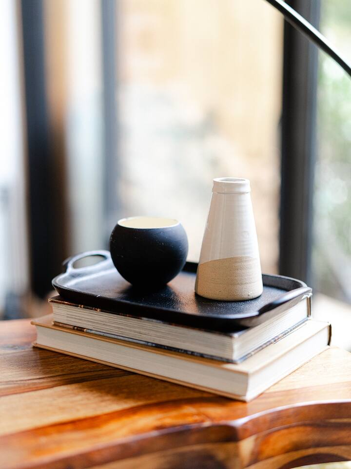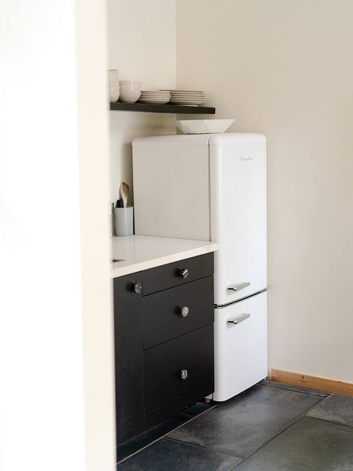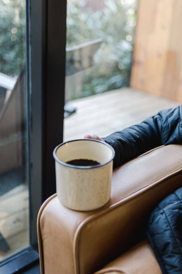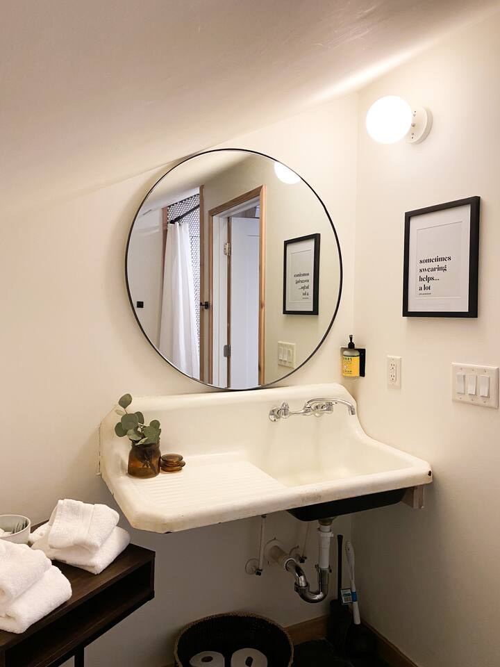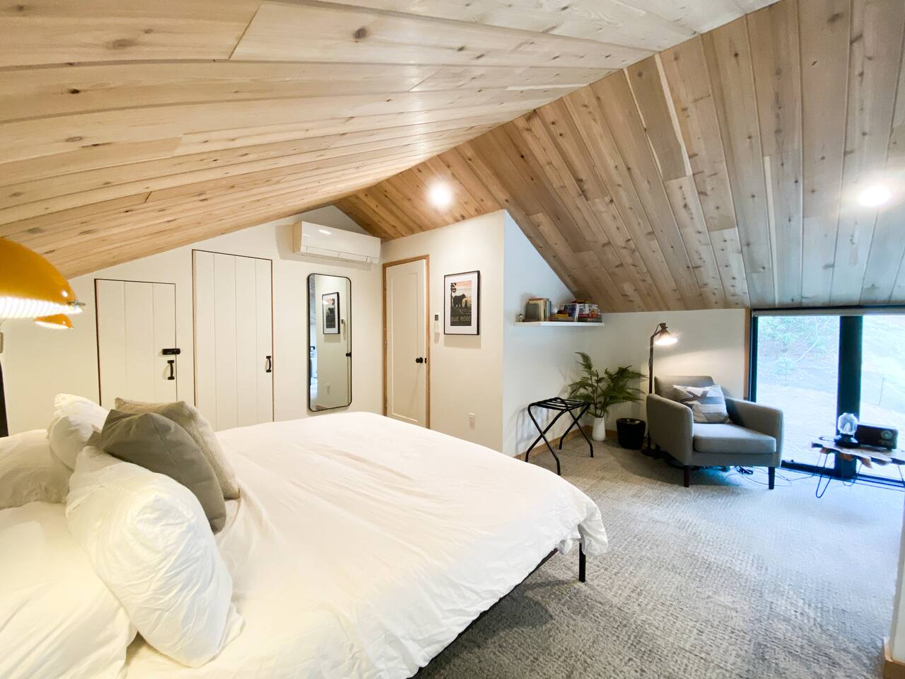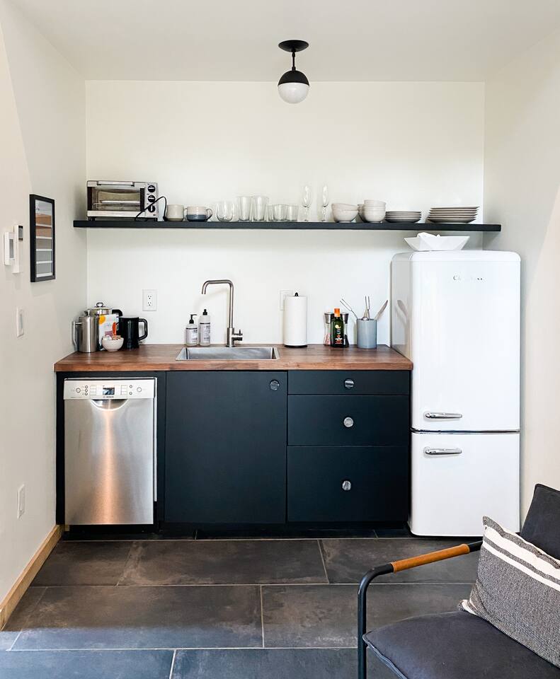This unit is a one bedroom, one bathroom with a kitchenette and is on the front of the cabin. Our kitchenette offers a French press, electric kettle, and milk frother to start your day off right, as well as a toaster oven and electric skillet to eat breakfast in bed. So that your toes never get cold, the unit has heated tile floors through out and a Malm fireplace to snuggle in front of. The king sized Tuft and Needle bed is covered in the softest 100% cotton sheets and duvet. Pillows have been selected to give options so you can find the perfect pillow. Lunori was crafted to allow our guests to slow down, enjoying the simpler things that the mountains offer. While the crazy day to day of our lives keeps us always connected with little patience, the mountains give us a chance to take a breath. For this reason we have stocked the unit’s bookshelf with a curated collection of books, games, and bluetooth speaker. We offer wifi internet but we do not offer TVs or microwaves, simply because in the mountains you have time! We offer a communal firepit, charcoal grill, picnic area, and hammock. The communal area is shared with all 4 of our units.
